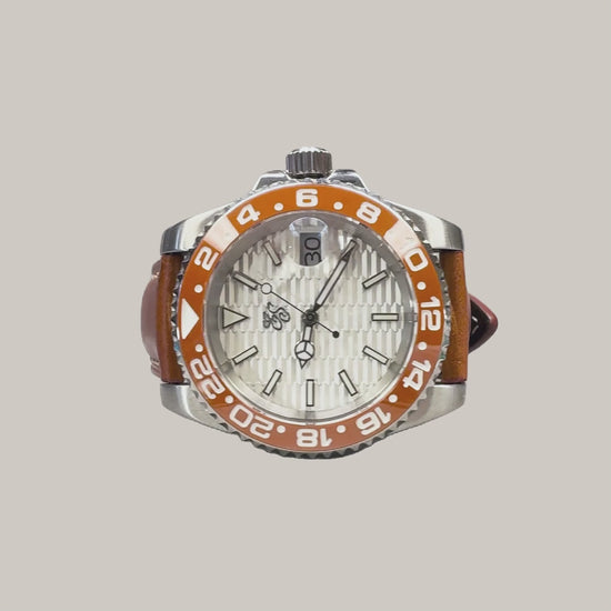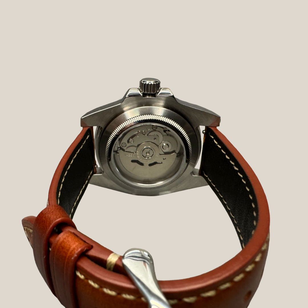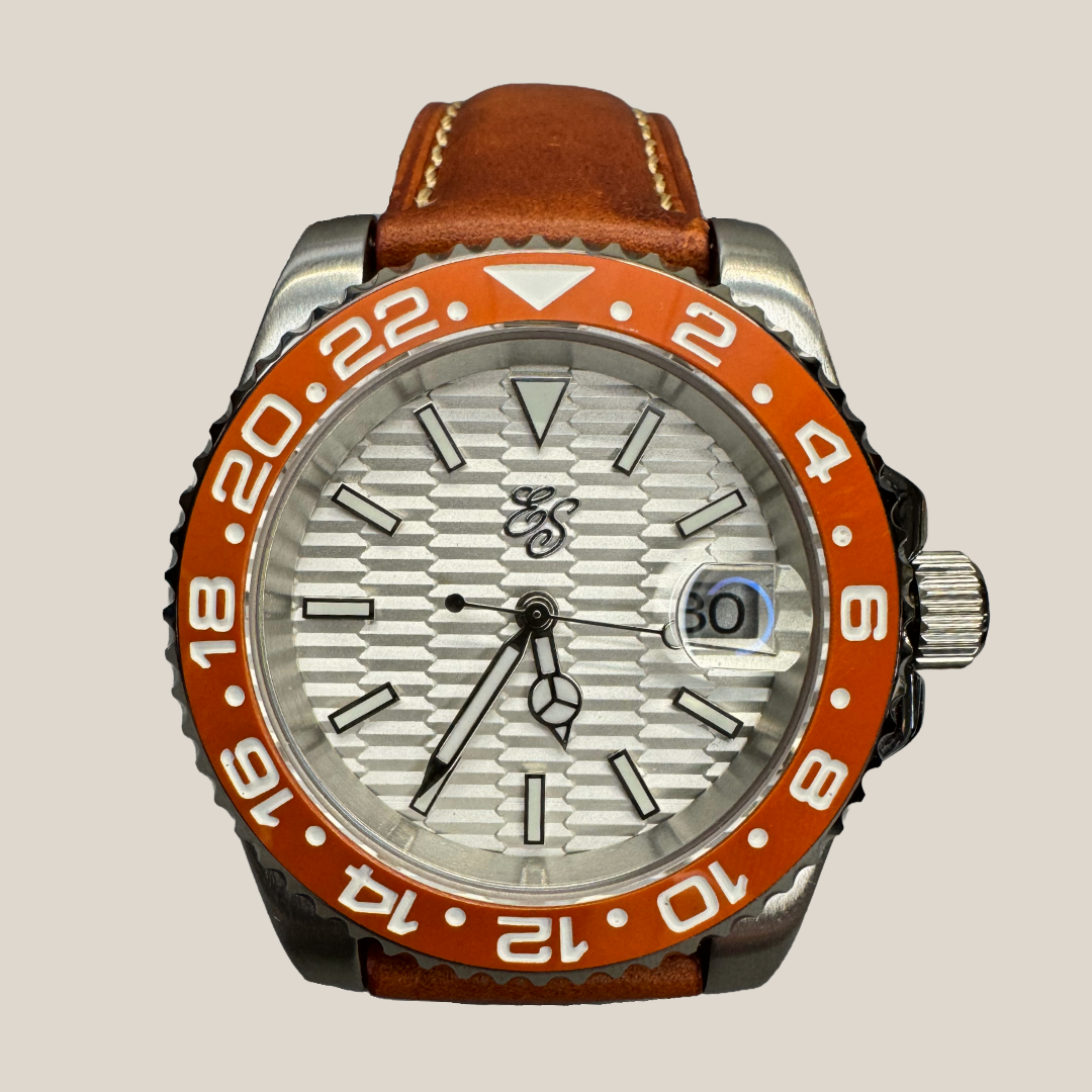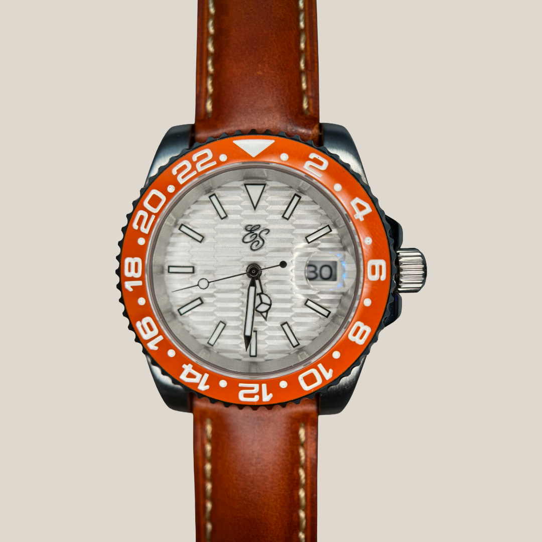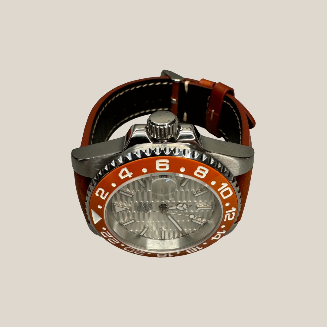 The Earl is a one-of-one automatic timepiece built around the NH35 movement. Its silver ridged dial and burnt orange 24-hour bezel nod to legacy, endurance, and quiet strength.