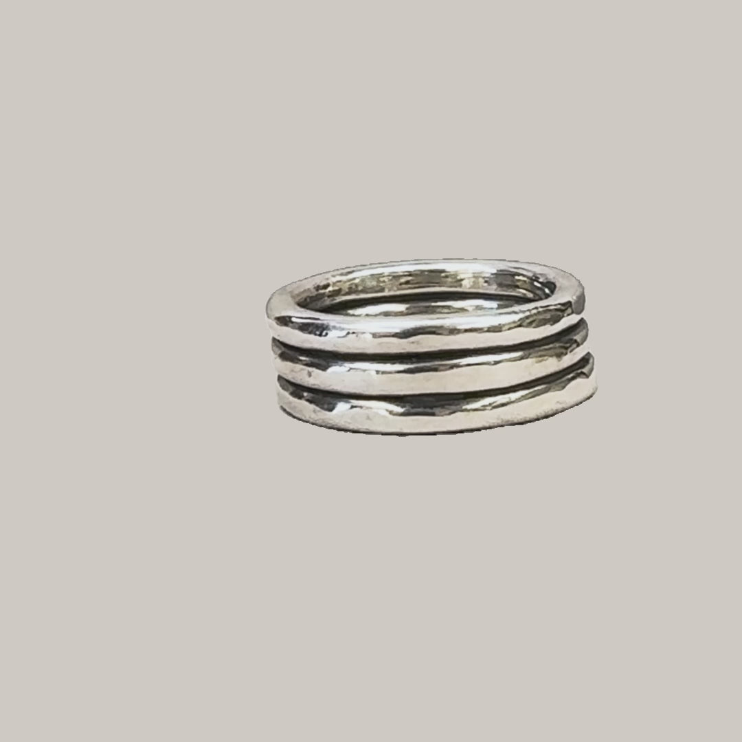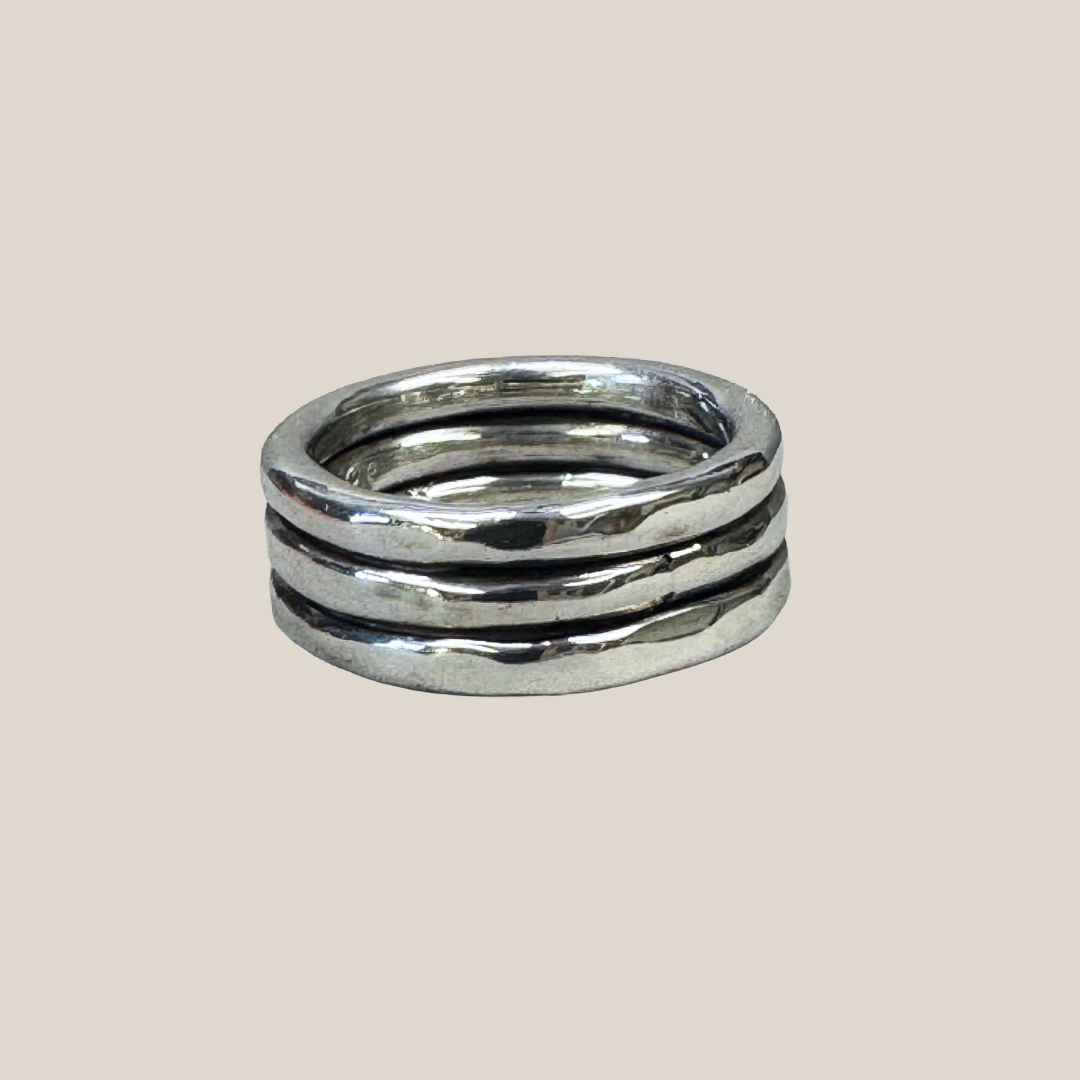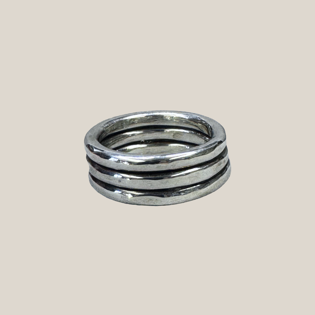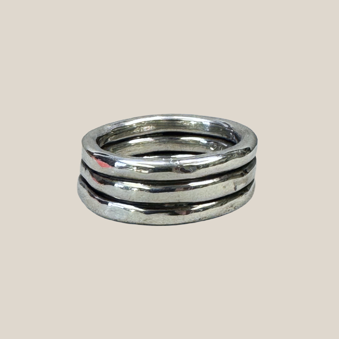 Cast one by one in sterling silver from hand-carved wax, Triunestep is a stacked band forged in rhythm—three layers fused into a single ring, symbolic of movement, memory, and resolve.